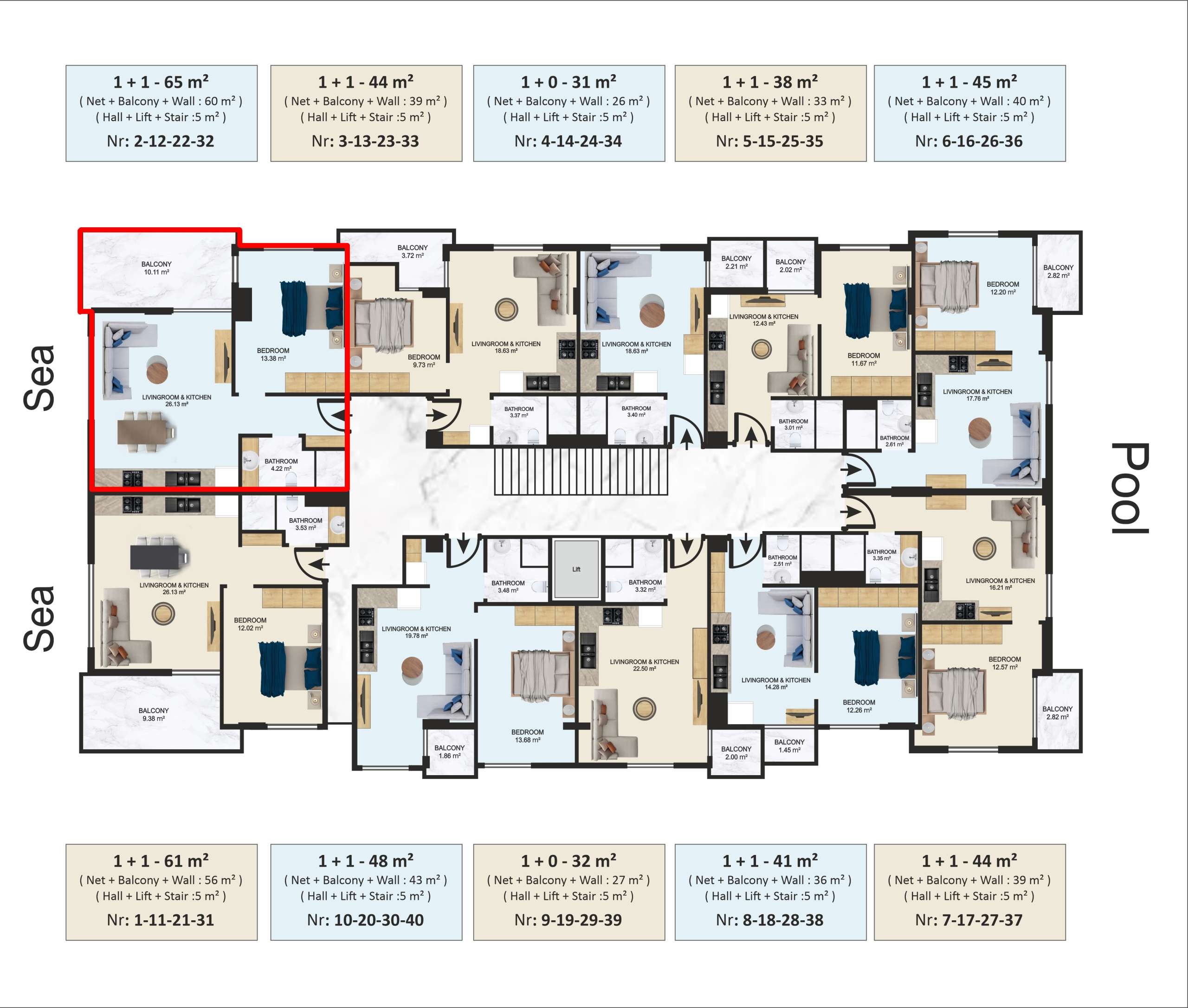 Резиденция будет реализована в нео-классическом стиле и представлять собой 1 жилой блок из 6-ти этажного здания. В общей сложности 48 квартир. Представленные апартаменты 1+1 имеют вид на море.
